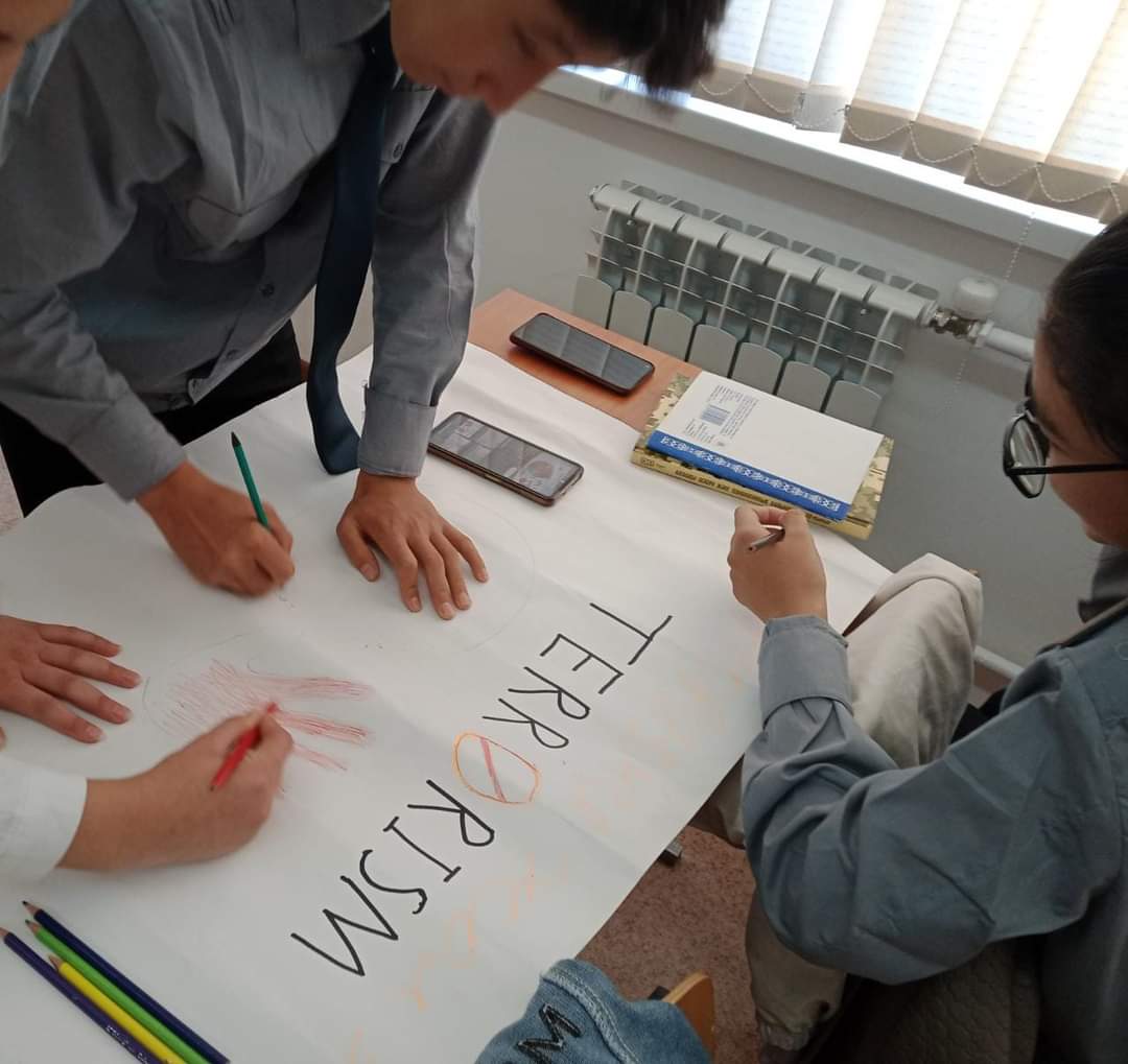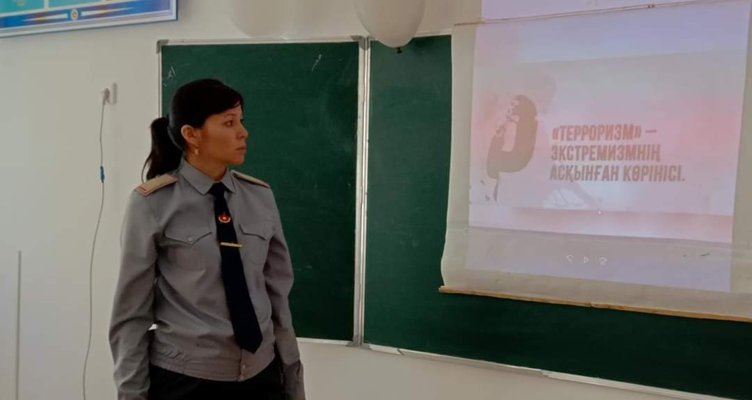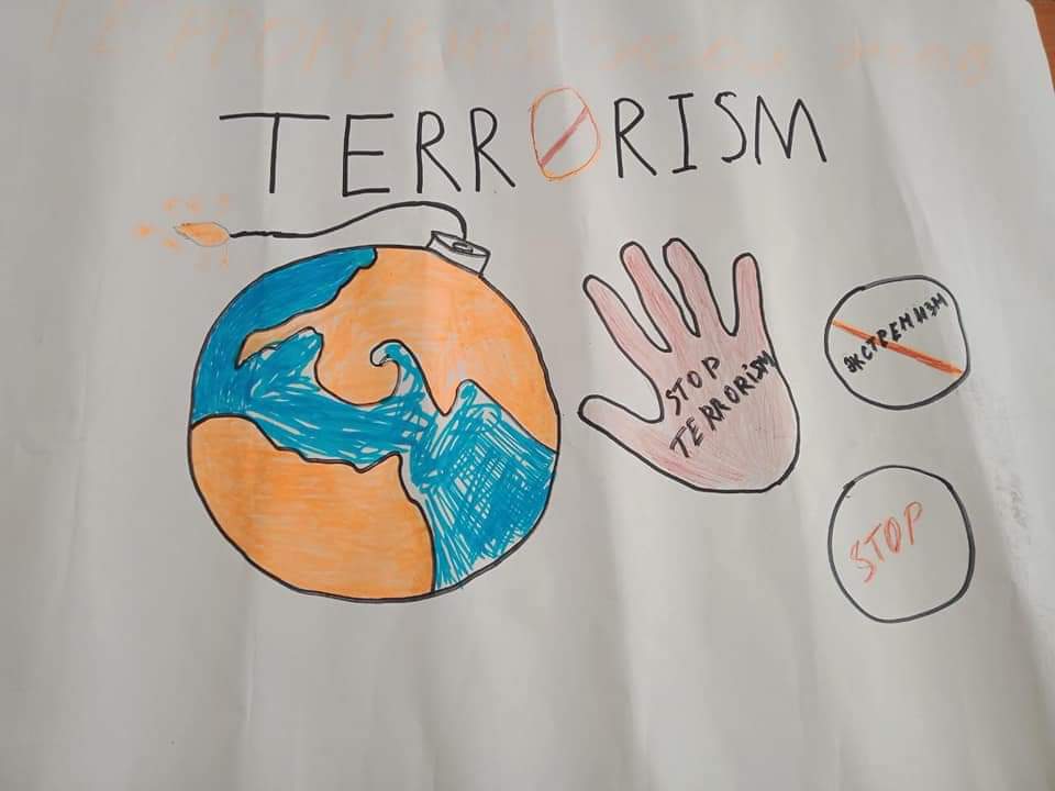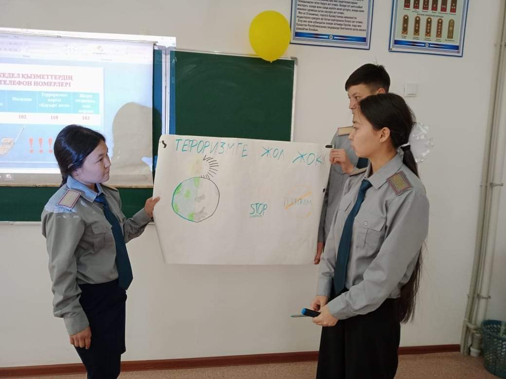 Оқушыларға терроризм туралы терең тусінік беру,себептері мен зардаптарын ұғындыру, жасөспірімдерге бейбітшіліктің маңызын және мейірімділік пен ізгіліктің,адамдарға жақсылық жасай білудің басты ұстанымы екенін ұғындыру мақсатында, 10-сынып оқушылар арасында "Терроризм -адамзат қасіреті" - атты тақырыпта оқушыларға видеосабақ көрсетіліп, қалай қорғану керектігі түсіндірілді.Өткізген әскери жетекші Ф.Б.Айманбетова.