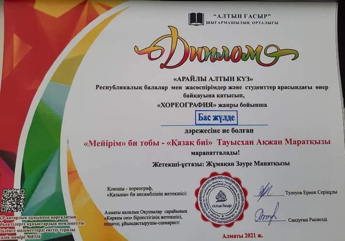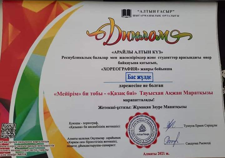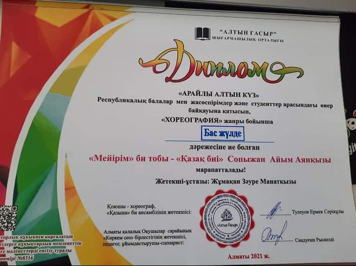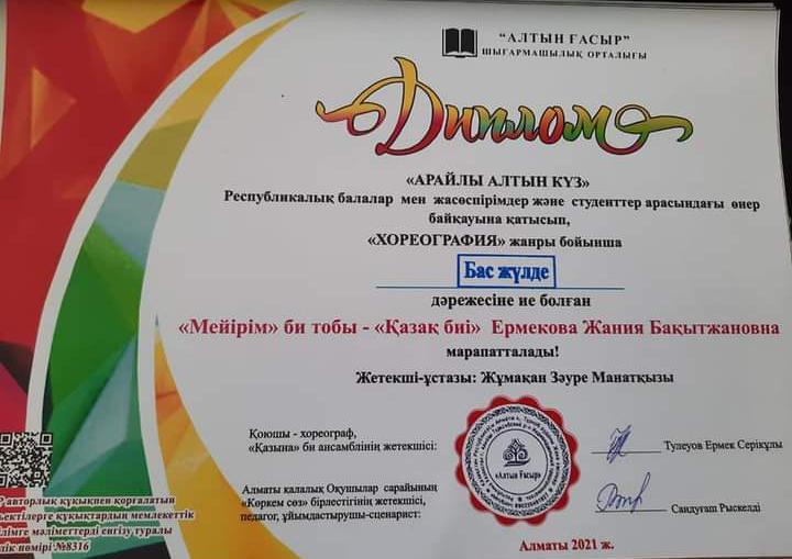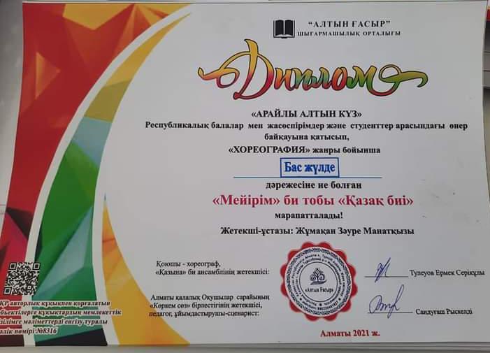 Республикалық балалар мен жасөспірімдер және студенттер арасындағы өнер байқауына қатысып, "Хореография" жанры бойынша "Мейірім" би тобы "Қазақ биі" нен Бас жүлдеге ие болды.