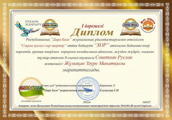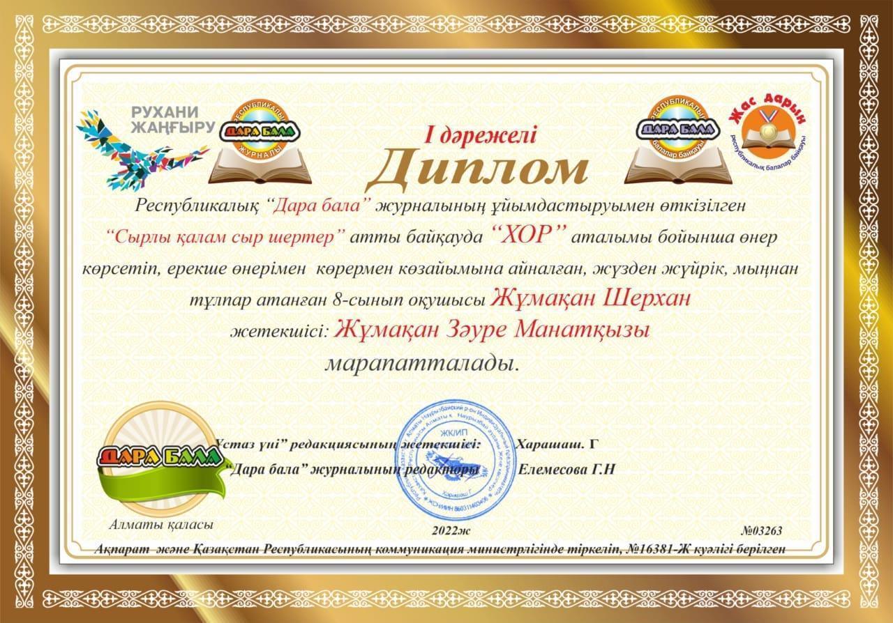 Республикалық "Дара бала" журналының ұйымдастыруымен өткізілген Сырлы қалам сыр шертер" атты байуда "ХОР" аталымы бойынша өнер көрсетіп, ерекше өнерімен көрермен көзайымына айналған, жүзден жүйрік, мыңнан тұлпар атанған 8-сынып оқушылары I дәрежелі Дипломдармен марапатталды.