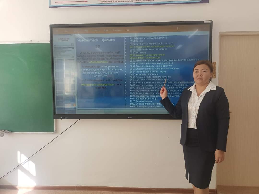Кәсіптік бағдар бойынша жұмыс барысында білім алушылар мамандықтар әлемімен танысты. Қызығушылық танытқан мамандықтарға қатысты кеңестер беріліп, таңдаған мамандықтар туралы ақпарат берілді. 11-сынып білім алушыларының кәсіби бағыттылығын диагностикалау нәтижелері бойынша сауалнама алынды. Оқушылар сауалнамаға белсене қатысты.