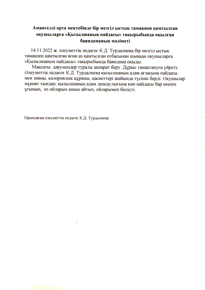 "Қызылшаның пайдасы" тақырыбында оқылған баяндаманың мәліметі » СШ им.Амангелды