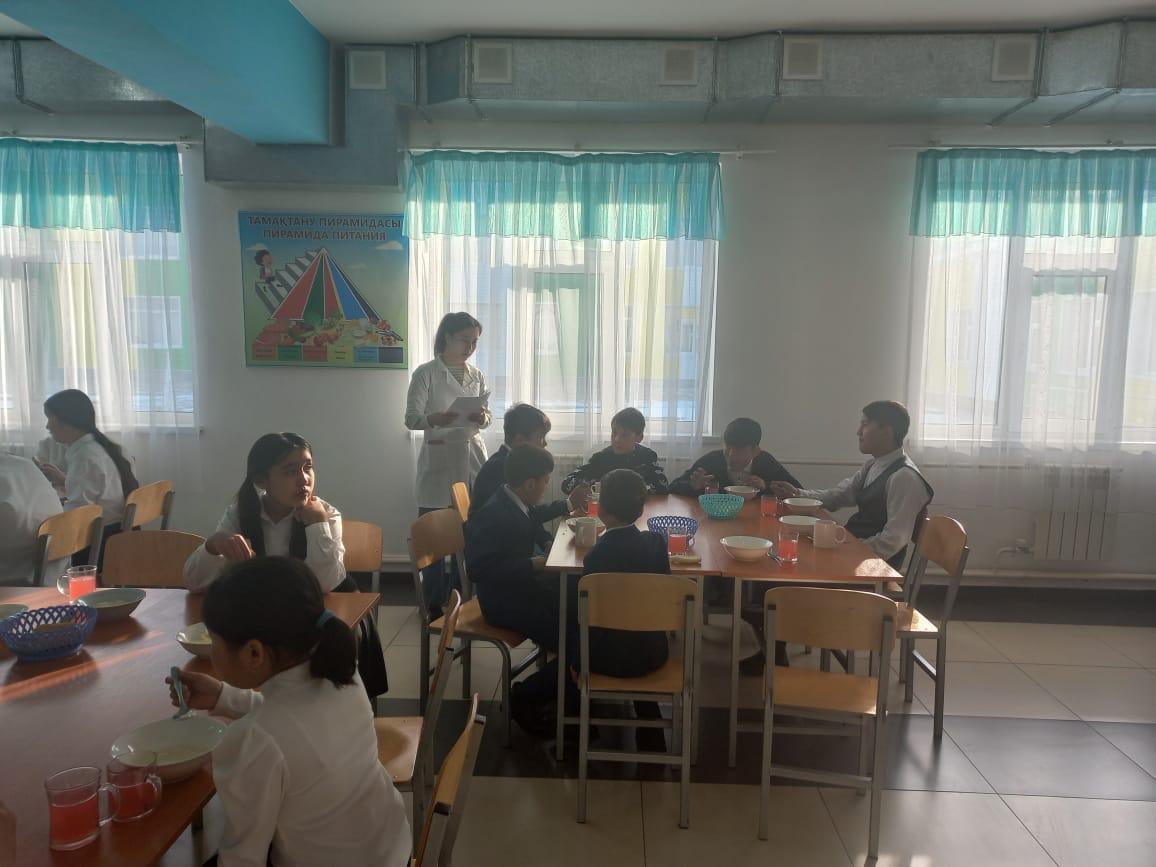 Амангелді орта мектебінде бір мезгіл тегін ыстық тамақпен қамтылған оқушыларға «Балықтың түрлері, оның адам ағзасына маңызы» тақырыбында оқылған баяндаманың мәліметі
