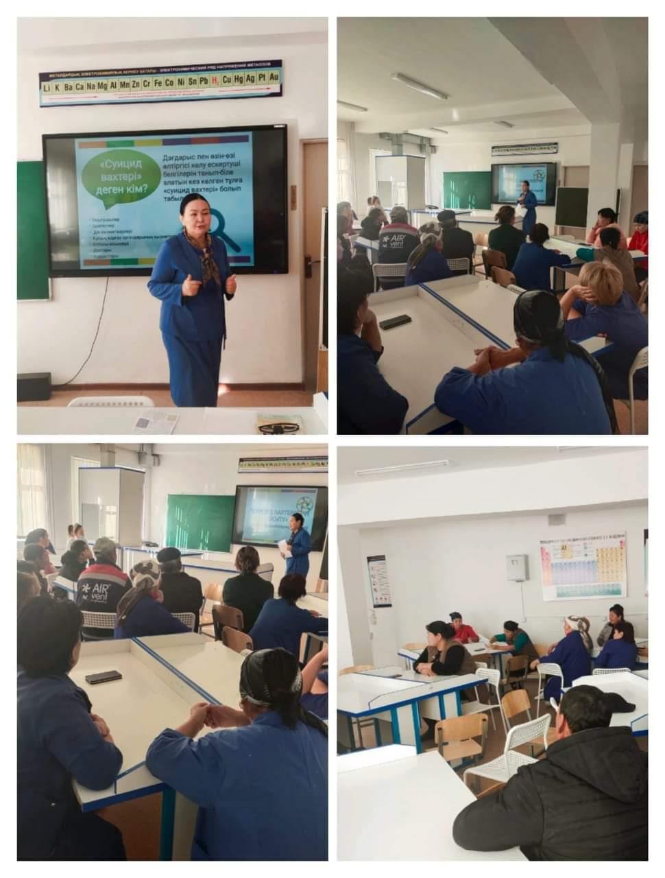отдела образования Шуского района Амангелді атындағы орта мектебінің психологы В. У. Алиева "Жамбыл обылысындағы камлетке толмағандар арасындағы суицидтер провенциясы" бағдарламасы аясында жасөспірімдердің психикалық денсаулығын нығайту және аутодеструктивті мінез-құлқының алдын-алу мақсатында"Суицид әрекеттерінің алдын-алудағы мектеп рөлі"тақырыбында вахтёрларды оқыту семинары жүргізді.