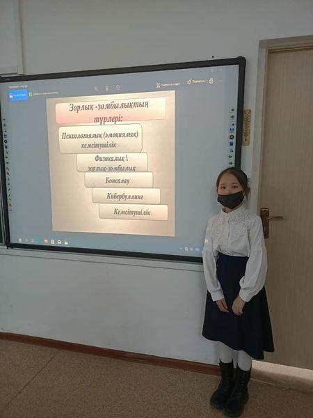 Мақсаты: оқушыларға зорлық-зомбылық туралы мағлұмат беру, адамның жаны мен тәніне үлкен зардап әкелетін соққы екенін түсіндіру және зорлыққа қарсы біздің елімізде заң бар екенін айту. Школьникам мейірімді болуға, бұзақылық істерге бармауға, адамгершілік қасиеттерін сақтауға, әдепті, тәртіпті тұлға болып өсуіне