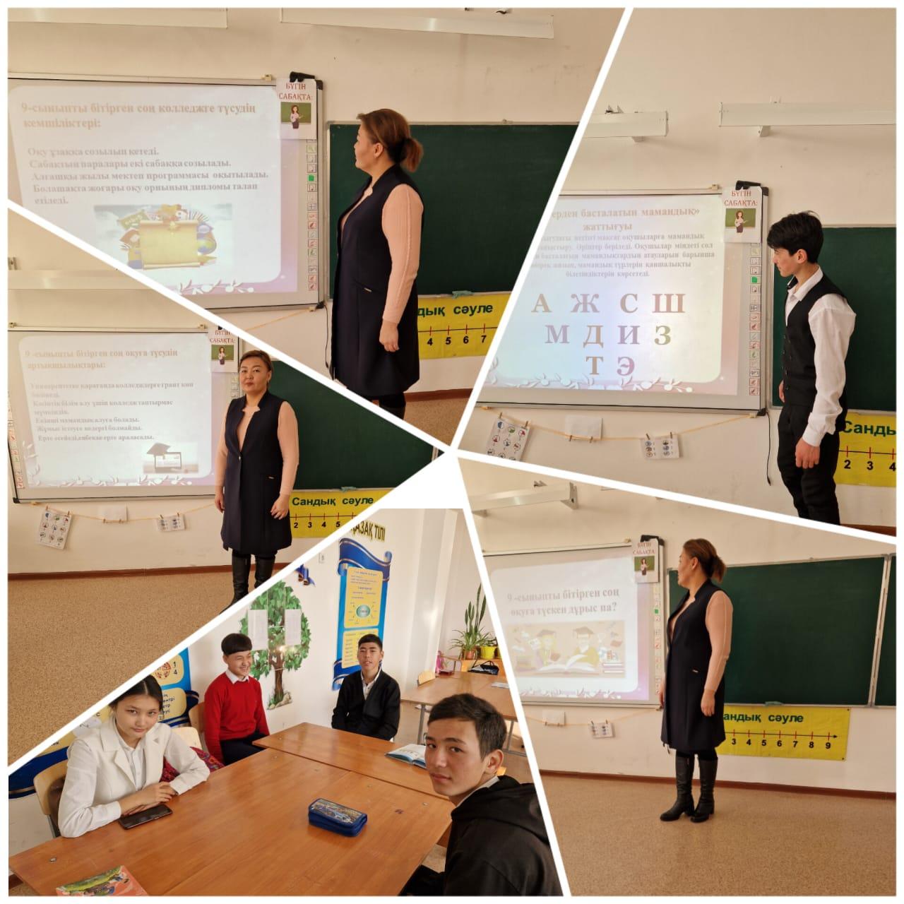 9-сынып оқушыларымен «Мамандық таңдау мектептен басталады», «9-сыныпты бітірген соң оқуға түскен дұрыс па?» тақырыбында дөңгелек үстел өтті.