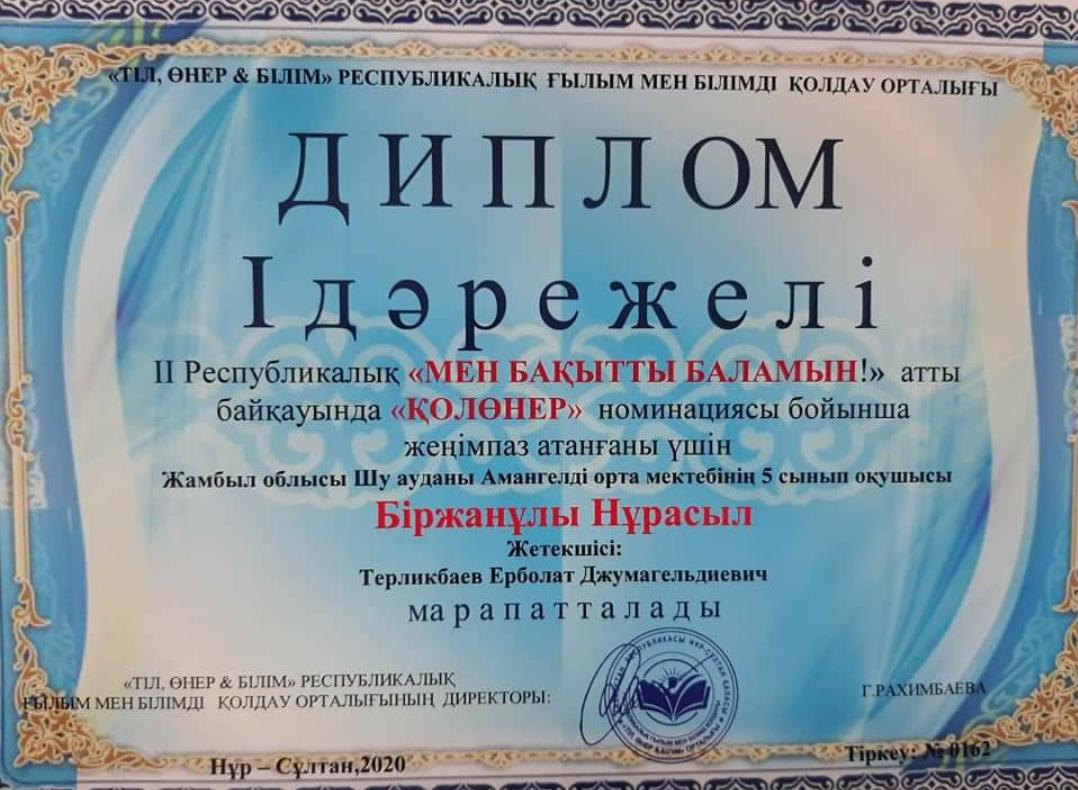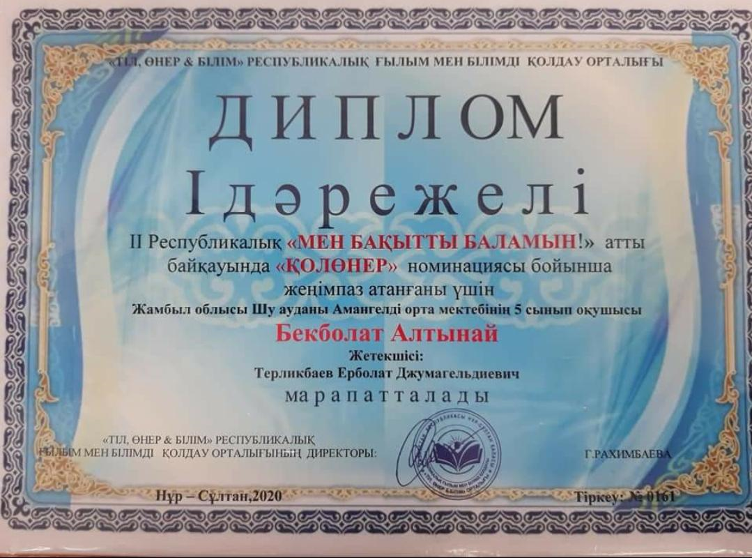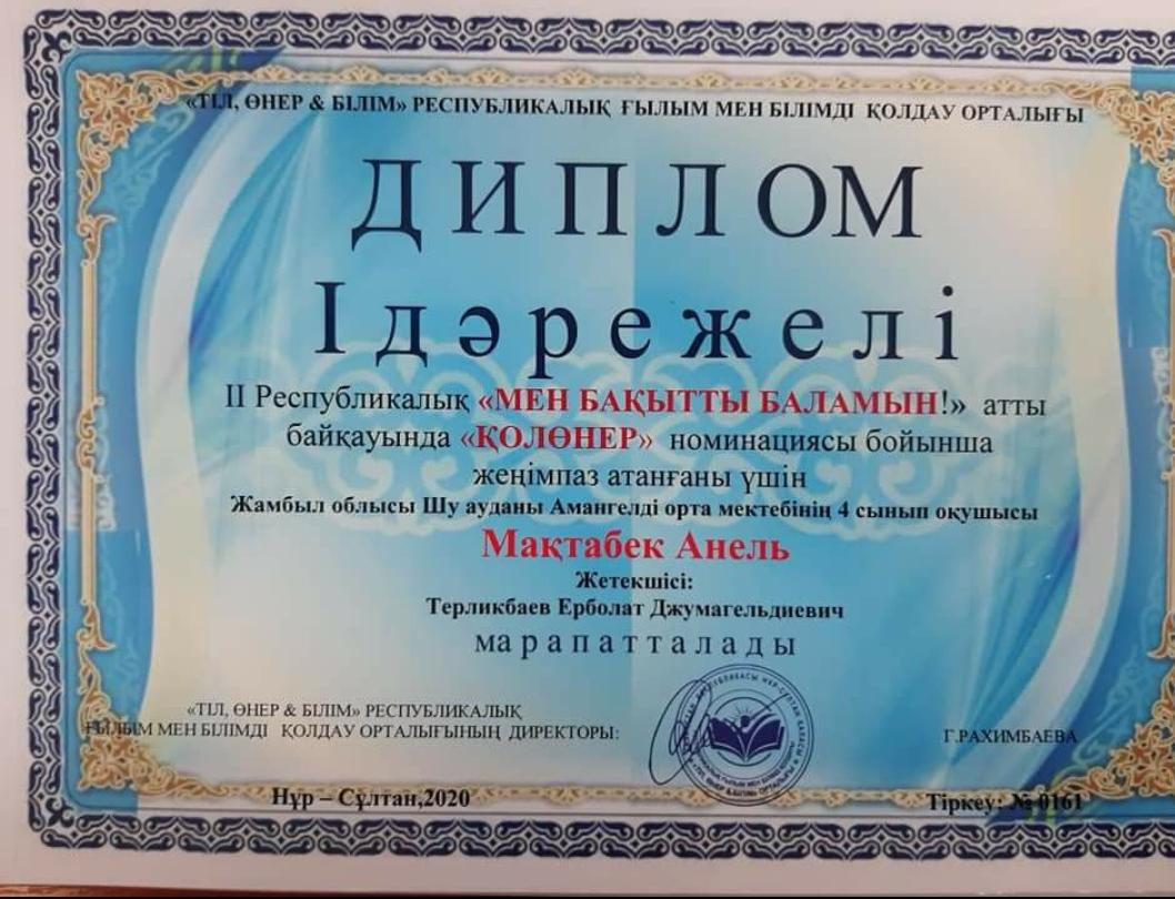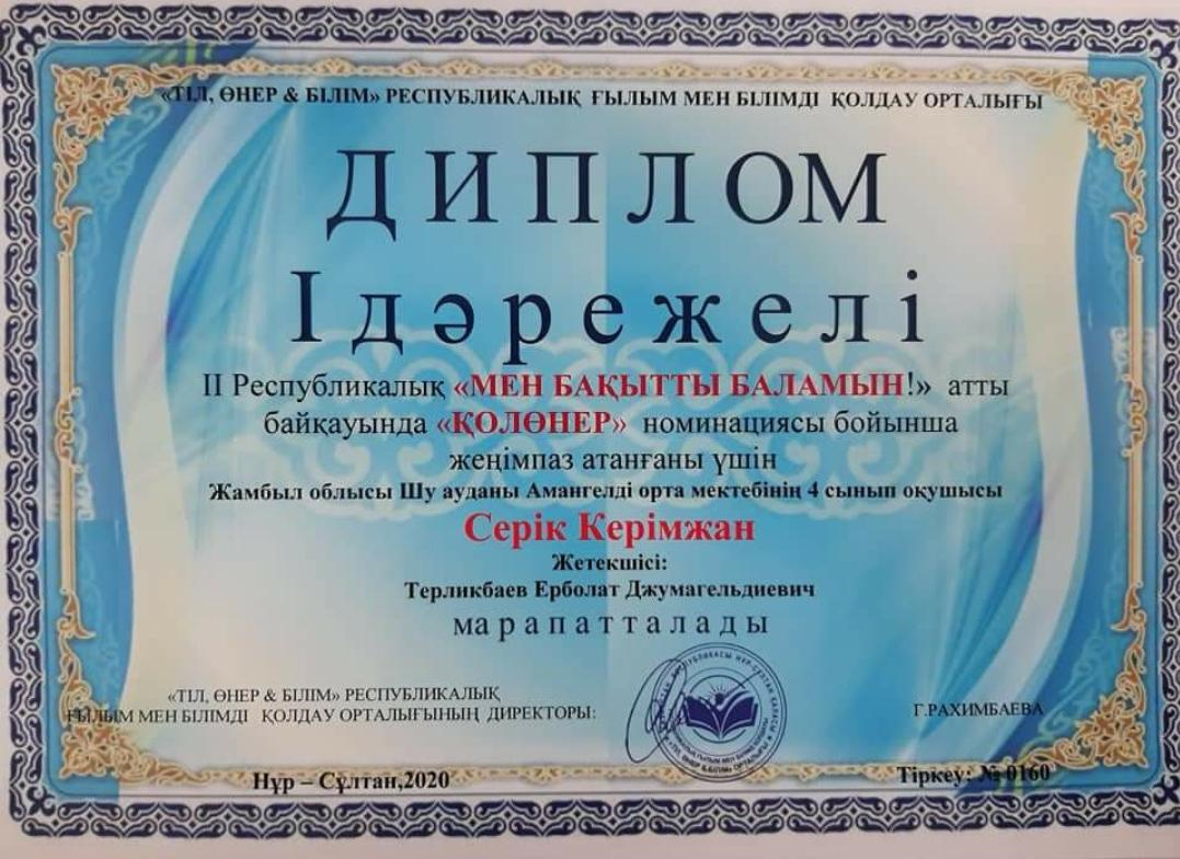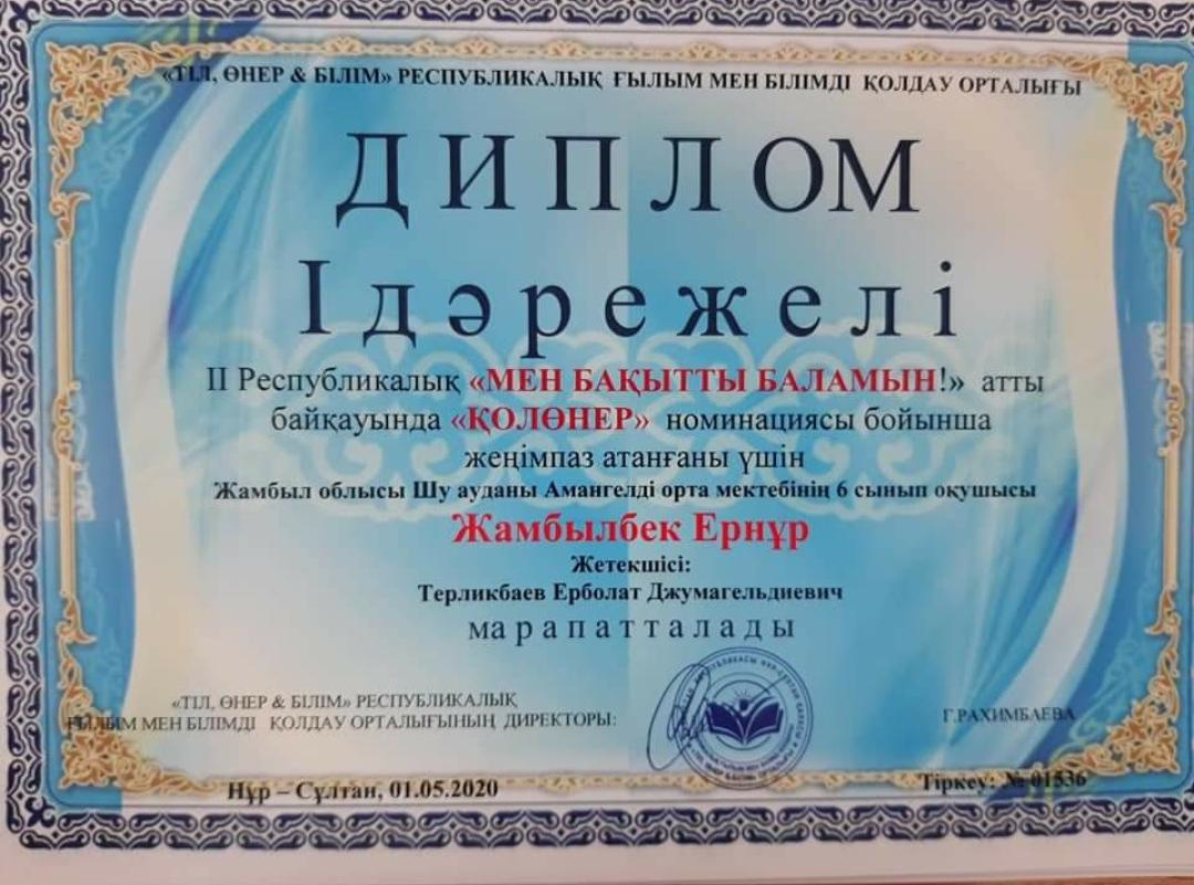 «Тіл, Өнер, & Білім» Республикалық Ғылым мен Білімді қолдау орталығы II Республикалық «Мен бақытты баламын!» атты байқауында «Қол Өнер» номинациясы бойынша жеңімпаз атанғаны үшін Жамбыл облысы Шу ауданы Амангелді орта мектебінің 6-7 сынып оқушылары I дәрежелі дипломдарымен марапатталды.