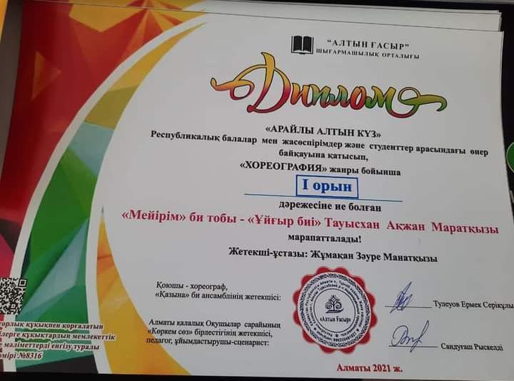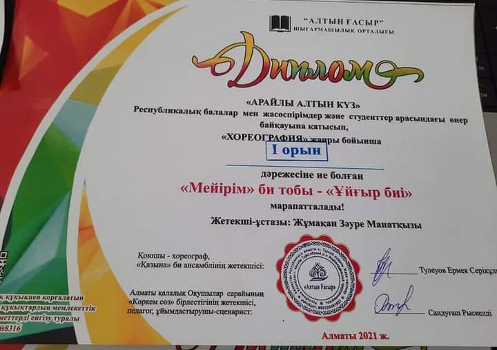 " Республикалық балалар мен жасөспірімдер және студенттер арасындағы өнер байқауына қатысып, "Хореография" жанры бойынша "Мейірім" би тобы "Ұйғыр биі" нен 1ші орын ие болды.