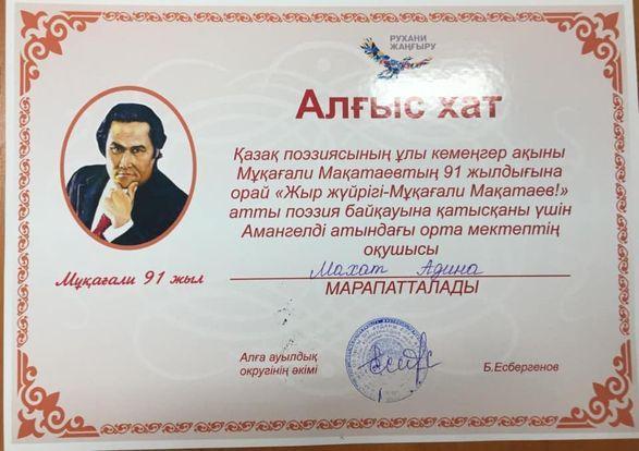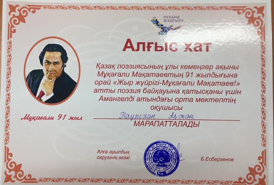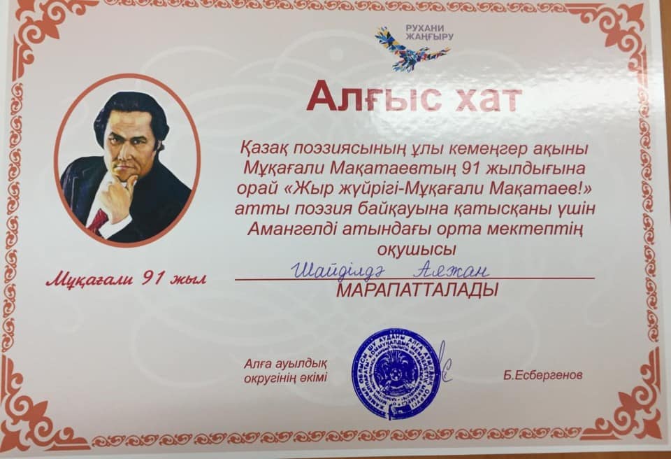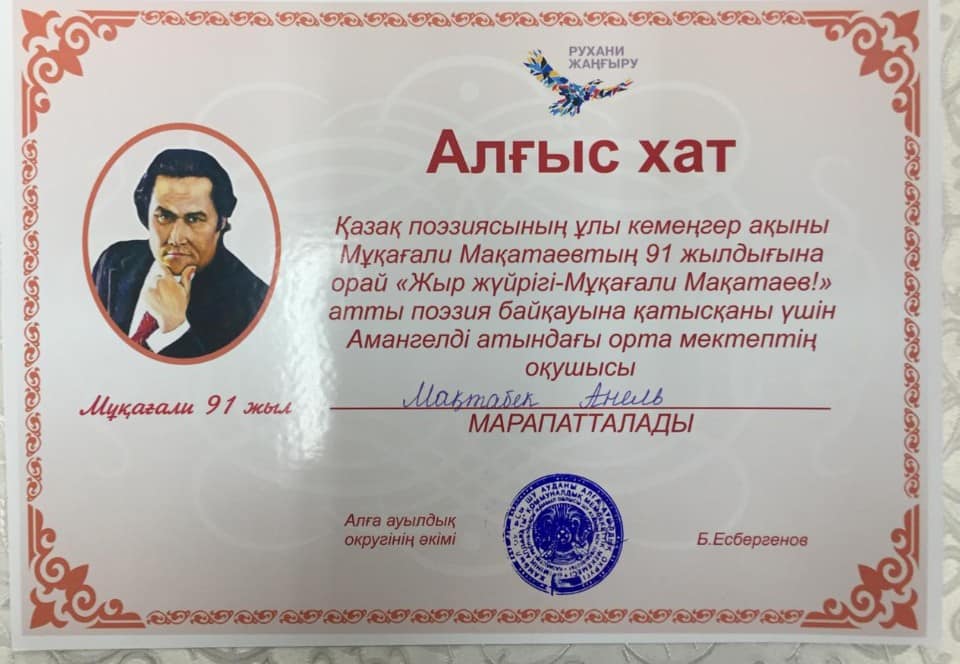 Қазақ поэзиясының ұлы кемеңгер ақыны Мұқағали Мақатаевтің 91жылдығына орай "Жыр жүйрігі -Мұқағали Мақатаев!" атты поэзия байқауына қатысқаны үшін Амангелді атындағы орта мектебінің оқушылары Алға ауылдық округінің әкімі Б.Есбергеновтің Алғыс хатымен марапатталды.